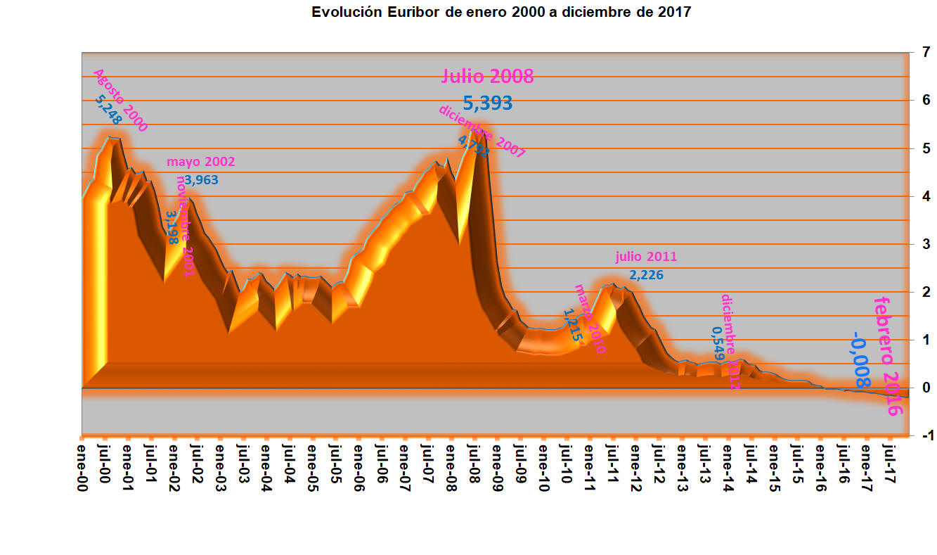 Fue en febrero de 2016, cuando el Euribor mostró su primer valor negativo, en lo que corresponde a la media mensual del Euribor a 12 meses, conocido como el Euribor hipotecario, por su utilización en el cálculo de los intereses a pagar en las hipotecas.